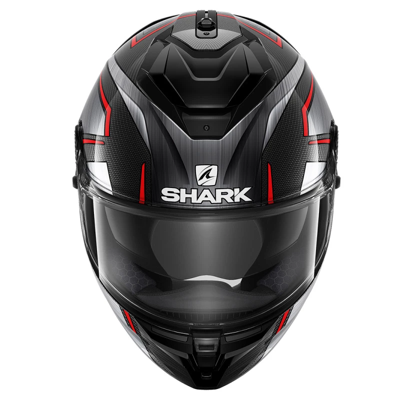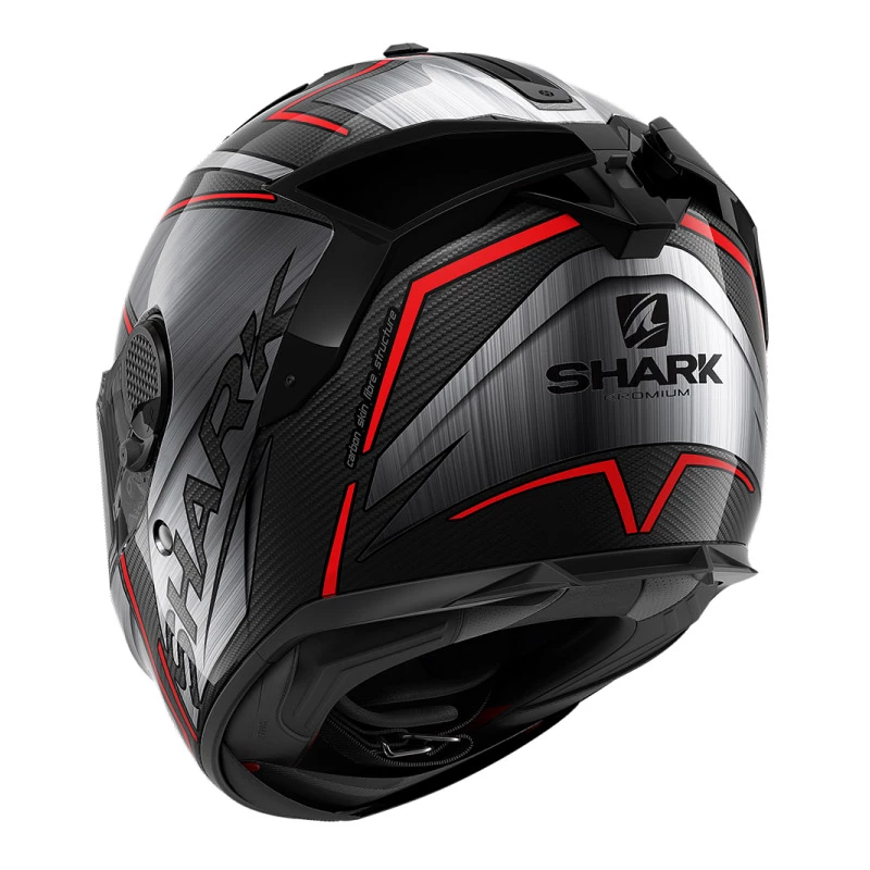 The SPARTAN GT, our brand-new fiber composite full-face helmet, features SHARK’s latest innovations and expertise acquired over the years. The combination of fiber and carbon layers, associated with the Multi-Density EPS, offers the highest level of protection. Spartan GT carbon finish. The SPARTAN GT has extended boundaries in terms of both safety and comfort, in the aim of satisfying expectations voiced by the most demanding racers. Structure and safety: Shell made of multiaxial fiberglass. 2 shell sizes for optimal morphological adjustment. Double-D ring strap. Multi-density EPS. “Shark Emergency Removal System” to allow for quick release of the helmet interior in case of emergency. Finish: 1. Carbon fibers and multiaxial fiber glass. 2. Multiaxial glass fiber. Visor: Optical Class 1-rated visor featuring variable thicknesses and an anti-scratch treatment. Pinlock Max Vision® included in the box. New ergonomic visor locking system, complete with an airflow position. “Ultra soft” visor notching movement. UV380-labeled visor treated to resist scratches. Quick visor release system. Inside: SANITIZED®-labeled ALVEOTECH lining fabric featuring antimicrobial properties. Removable interior suitable for machine washing (30°C max). “3D morpho” cheeks. “EasyFit” system: Optimal comfort for riders wearing glasses. “Dual use” anti-fog breath guard. Anti-fog mask. Slot reserved for the Sharktooth® interco. Aerodynamics and ventilation: 2 air inlets. 2 air extractors with position ON/OFF switch. Aerodynamics optimized by means of CFD (Computational Fluid Dynamics) design studies. Aerodynamically-shaped “SHARK Skin” peak side fastenings favoring passive noise abatement.