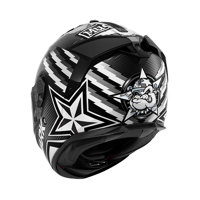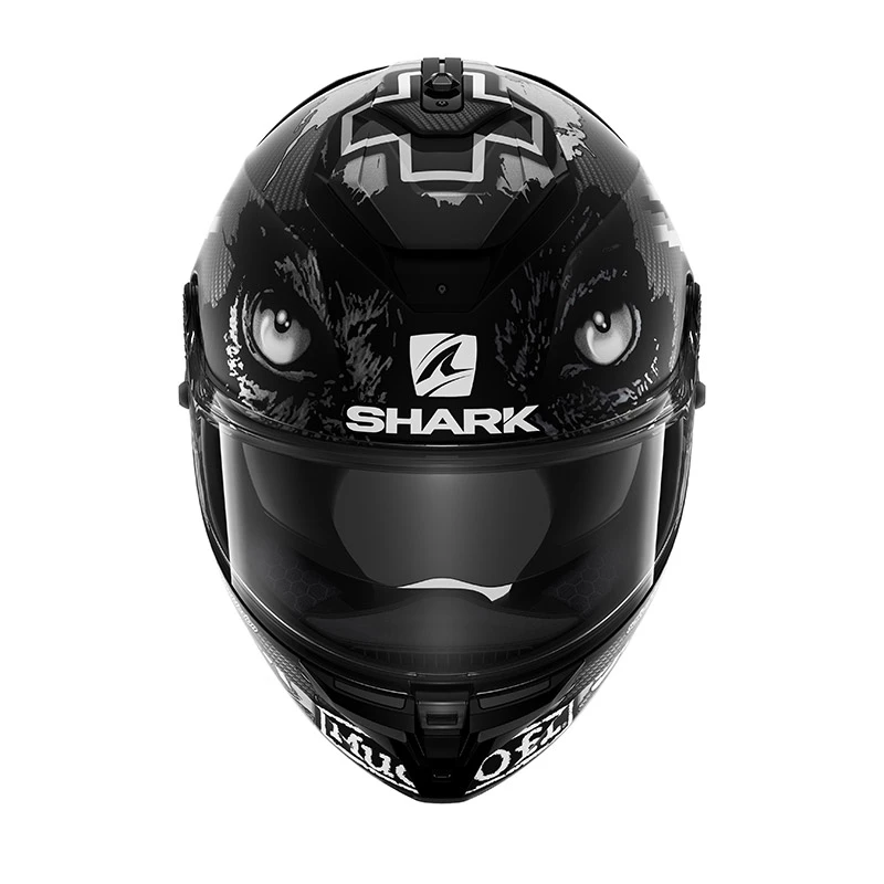 The SPARTAN GT, our brand-new fiber composite full-face helmet, features SHARK’s latest innovations and expertise acquired over the years. The combination of fiber and carbon layers, associated with the Multi-Density EPS, offers the highest level of protection. Spartan GT carbon finish. The SPARTAN GT has extended boundaries in terms of both safety and comfort, in the aim of satisfying expectations voiced by the most demanding racers. Structure and safety: Shell made of multiaxial fiberglass. 2 shell sizes for optimal morphological adjustment. Double-D ring strap. Multi-density EPS. “Shark Emergency Removal System” to allow for quick release of the helmet interior in case of emergency. Finish: 1. Carbon fibers and multiaxial fiber glass. 2. Multiaxial glass fiber. Visor: Optical Class 1-rated visor featuring variable thicknesses and an anti-scratch treatment. Pinlock Max Vision® included in the box. New ergonomic visor locking system, complete with an airflow position. “Ultra soft” visor notching movement. UV380-labeled visor treated to resist scratches. Quick visor release system. Inside: SANITIZED®-labeled ALVEOTECH lining fabric featuring antimicrobial properties. Removable interior suitable for machine washing (30°C max). “3D morpho” cheeks. “EasyFit” system: Optimal comfort for riders wearing glasses. “Dual use” anti-fog breath guard. Anti-fog mask. Slot reserved for the Sharktooth® interco. Aerodynamics and ventilation: 2 air inlets. 2 air extractors with position ON/OFF switch. Aerodynamics optimized by means of CFD (Computational Fluid Dynamics) design studies. Aerodynamically-shaped “SHARK Skin” peak side fastenings favoring passive noise abatement.