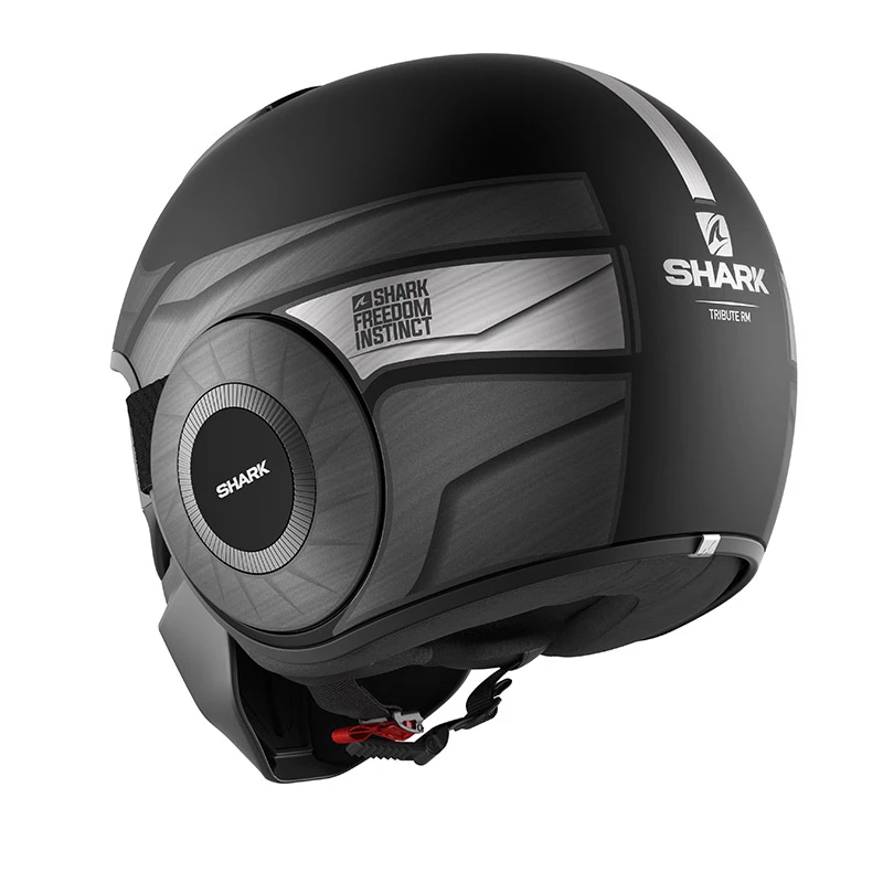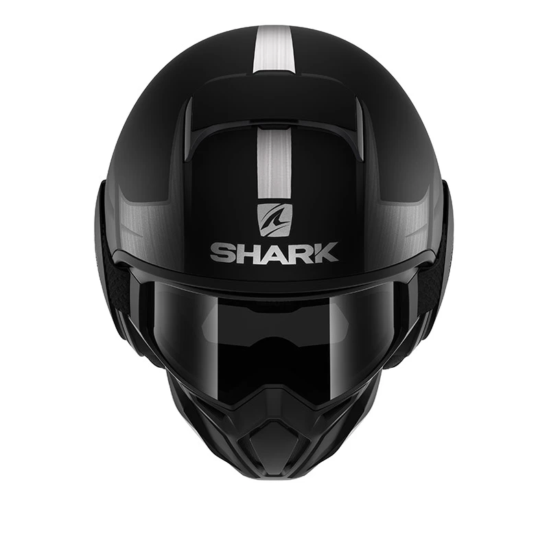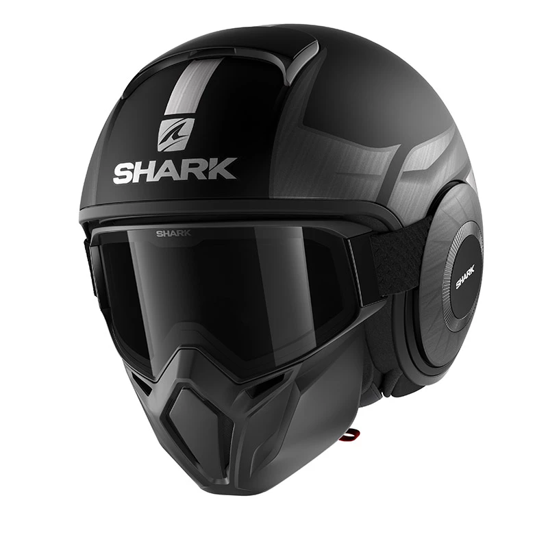 The new Shark Street-Drak helmet is here to let you live your fantasy. Formerly known as the Shark RAW helmet, the aviator inspired design combines a 3/4 thermoplastic shell with off-Road style goggles and a Mean-looking mask to create a perfect helmet to snatch the streets in whatever urban jungle is called home. The breathable lining and ventilation system also keeps the warmer heads fresh and while the plastic mask does not provide shock protection, it keeps the debris of the road away from your mouth.